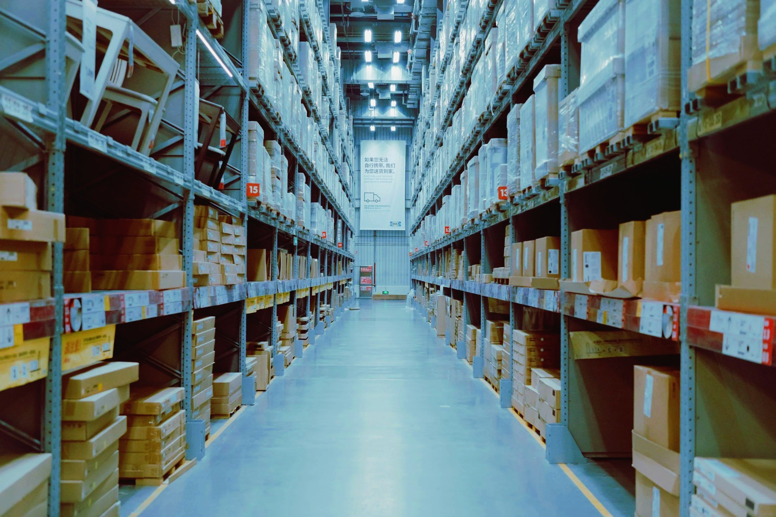 A well-lit warehouse aisle with metal shelves on both sides stocked with boxes and items, including chairs, with a sign at the far end and a delivery truck illustration.